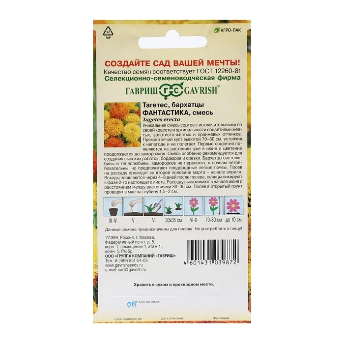 Уникальная смесь сортов с исключительными по своей красоте и оригинальности соцветиями желтых, золотисто-желтых и оранжевых оттенков. Прямостоячий куст высотой 70-80 см, устойчив к непогоде и не полегает. Первые соцветия появляются на растениях уже в июне и цветение продолжается до заморозков. Смесь особенно рекомендуется для создания высоких рабаток, бордюров и срезки. Бархатцы светолюбивы и теплолюбивы, заморозков не переносят, к почвам нетребовательны, но предпочитают плодородные легкие почвы. Посев на рассаду проводят во второй половине марта-начале апреля. Всходы появляются через 4-8 дней после посева, сеянцы пикируют в фазе 2-го настоящего листа. Рассаду высаживают в начале июня с расстоянием между растениями 30-35 см. Посев в открытый грунт проводят в мае на глубину 1,5-2 см.