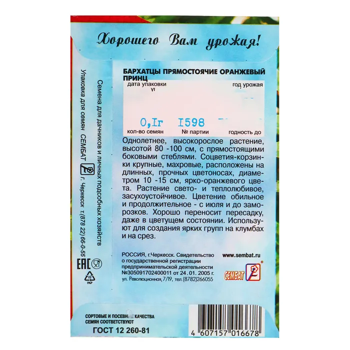 Однолетнее растение. Куст мощный, высотой 70 см. Побеги прочные.Гигантские густомахровые соцветия до 12 см в диаметре, расположенные на длинных и прочных цветоносах, окрашены в роскошный густо-оранжевый цвет. Прекрасно сочетается с любыми цветами и будет отлично смотреться в садовых контейнерах или вазонах. Устойчив к непогоде.