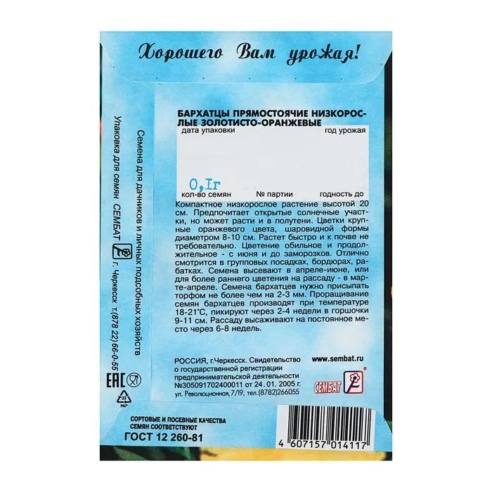 Однолетнее растение. Образует компактный кустик, высотой до 25см, имеющий по одному цветоносу в рассаде и по 4-5 в открытом грунте. Очень крупные, густомахровые цветки золотисто-оранжевого цвета будут являться основой любого яркого цветника, бордюра или клумбы Прекрасно сочетается с любыми цветами и будет отлично смотреться в садовых контейнерах или вазонах. Устойчив к непогоде.