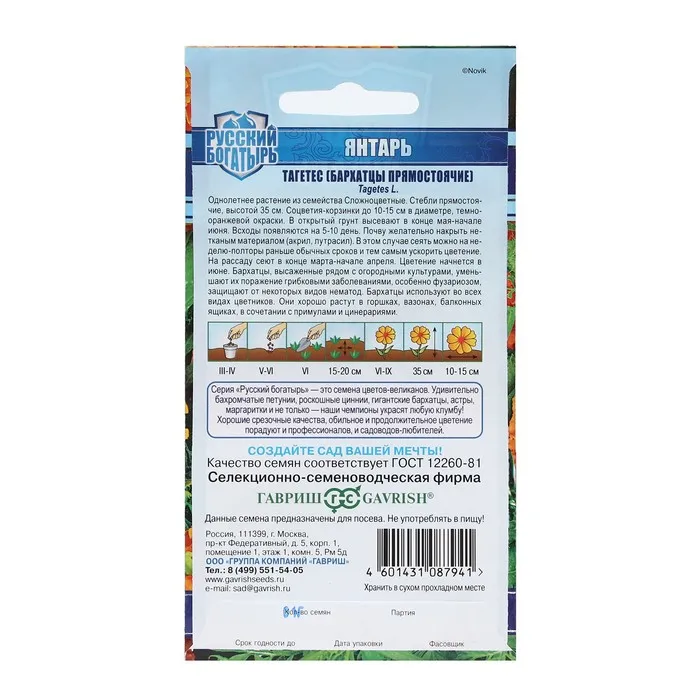 Семена цветов Бархатцы прямые (Тагетес) "Янтарь", ц/п, 30 см, 0,1 г — Характеристики