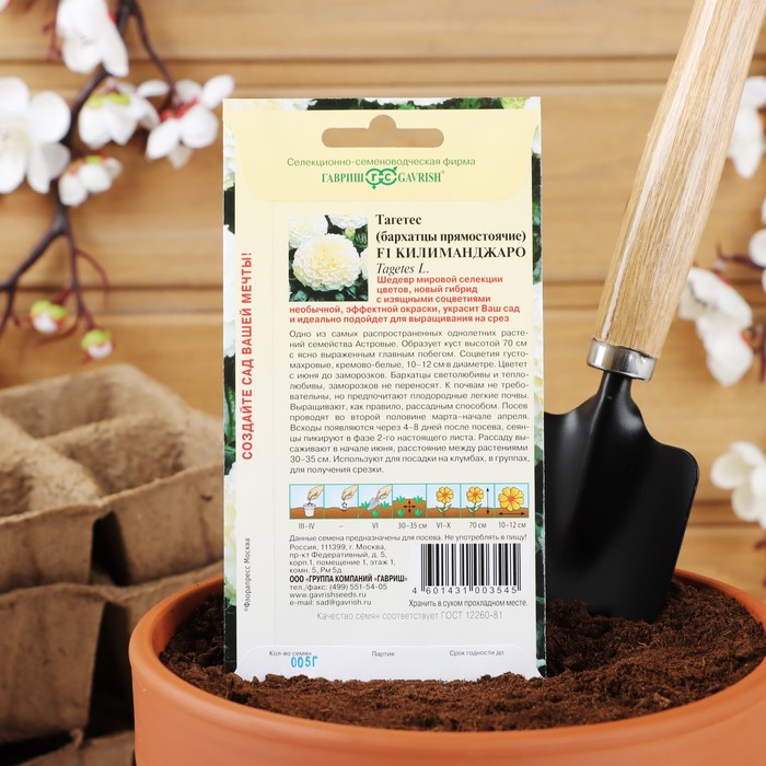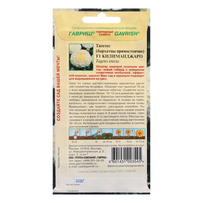 Семена цветов Бархатцы прямые (Тагетес) "Килиманджаро", ц/п, F1, 0,05 г — Характеристики