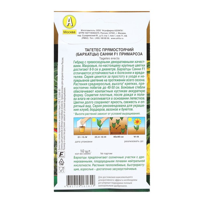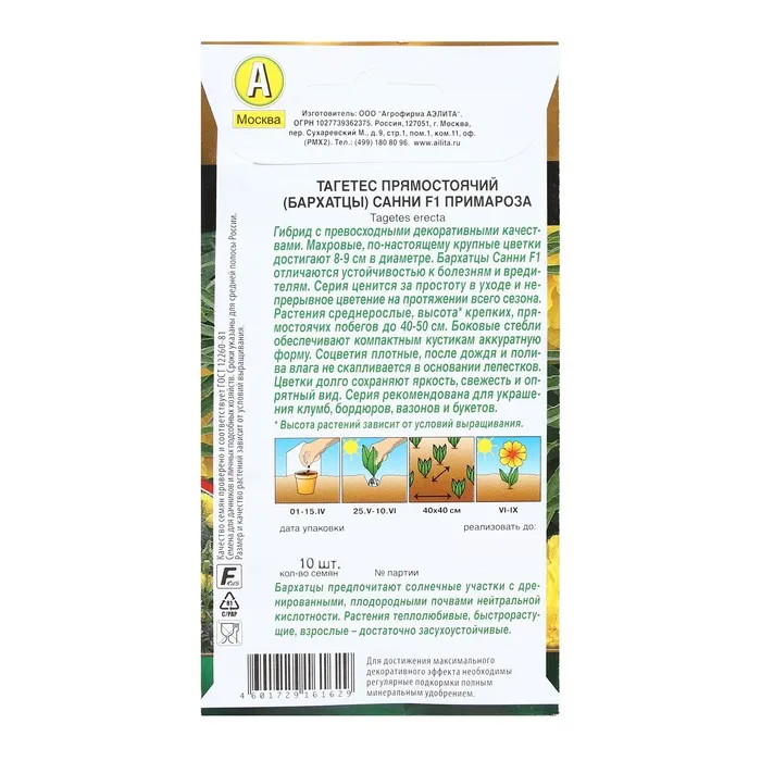 Семена Цветов Бархатцы "Санни", F1, примароза прямостоячие, 10 шт — Характеристики