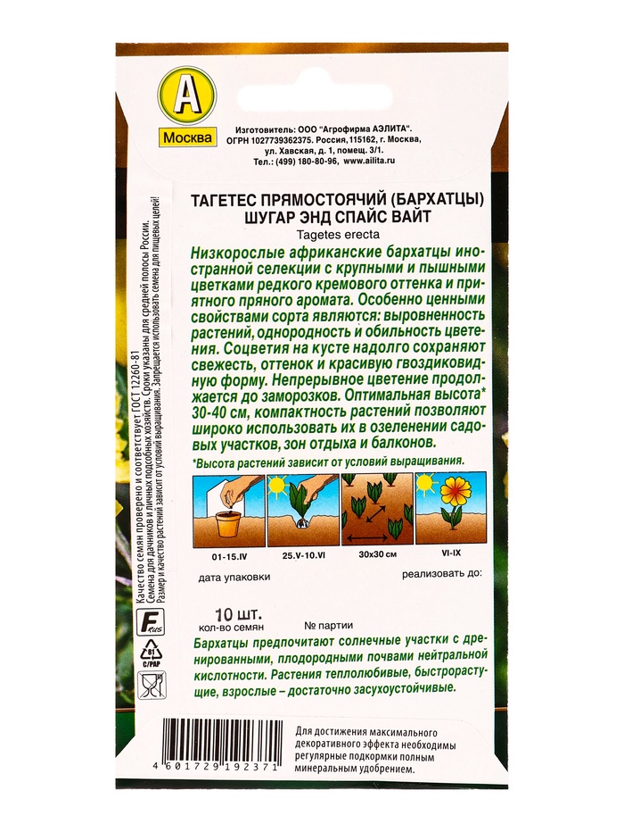 Семена цветов Бархатцы Шугар энд спайс вайт прямостоячие Золотая серия, Ц/П,10 шт. — Характеристики
