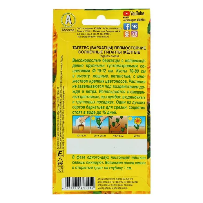 Семена цветов Бархатцы "Солнечные гиганты" желтые, О, 0,3 г — Характеристики