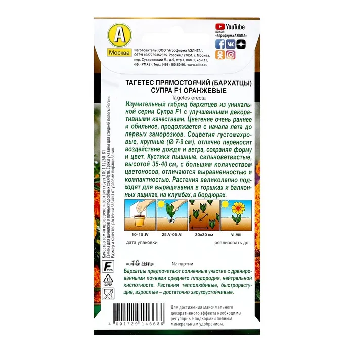 Семена цветов Бархатцы «Супра оранжевые» F1, прямостоячие, ц/п, 10 шт. — Характеристики