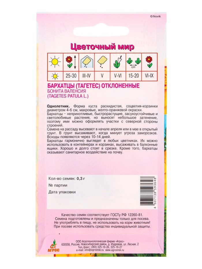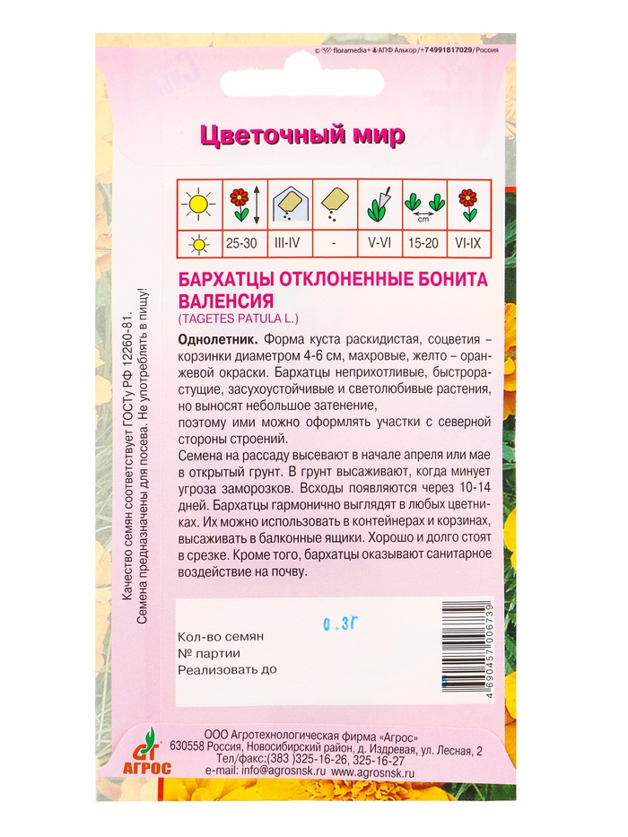 Семена цветов Бархатцы (тагетес) «Бонита Валенсия», 0.3 г, «Агрос» — Характеристики