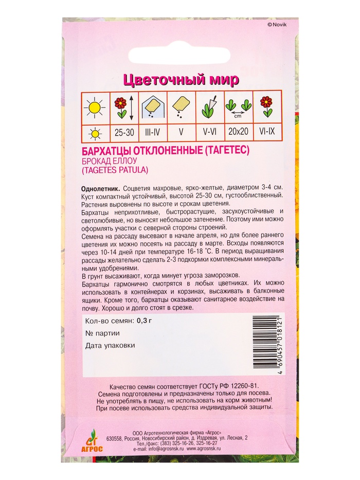 Семена цветов Бархатцы (тагетес) «Брокад Еллоу», 0.3 г, «Агрос» — Характеристики
