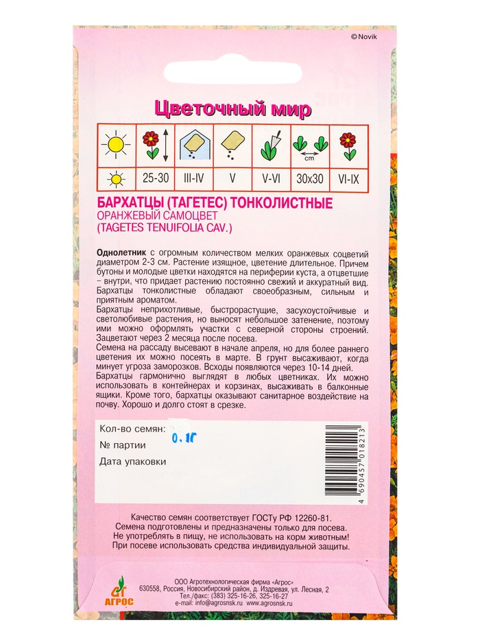 Семена цветов Бархатцы (тагетес) «Оранжевый самоцвет», тонколистные, 0.1 г, «Агрос» — Характеристики