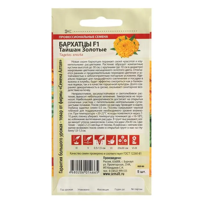 Новая серия бархатцев поражает своей красотой и изумительными расцветками. Растение образует компактные кустики высотой до 30 см, с крупными (до 10 см в диаметре) махровыми цветками насыщенного золотого цвета. Отличается ранним и продолжительным периодом цветения и устойчивостью к неблагоприятным погодным условиям. Идеально подходит для ландшафтного озеленения и посадки в вазоны и клумбы, будет эффектно смотреться как в балконных ящиках, так и в качестве горшечной культуры. Долго сохраняет декоративность в срезке, оказывает санитарное воздействие на почву. Неприхотливое, засухоустойчивое и светолюбивое растение, выносит небольшое затенение. Заморозков не переносит. Наибольшей декоративности достигает на открытых солнечных участках с питательными нейтральными суглинистыми почвами. Посев семян на рассаду проводят в марте. Глубина заделки семян 0,5 см. Посевы накрывают черной плёнкой для поддержания необходимого уровня влажности. При температуре +20-22°С всходы появляются через 7-10 дней, пленку убирают, температуру понижают до +16-18°С, во избежание вытягивания рассады. В грунт высаживают, когда минует угроза заморозков. Схема посадки 20х30 см. Цветение – через 2-2,5 месяца от посева. В районах с мягким климатом возможен посев семян в открытый грунт в мае на глубину 1,0-1,5 см.