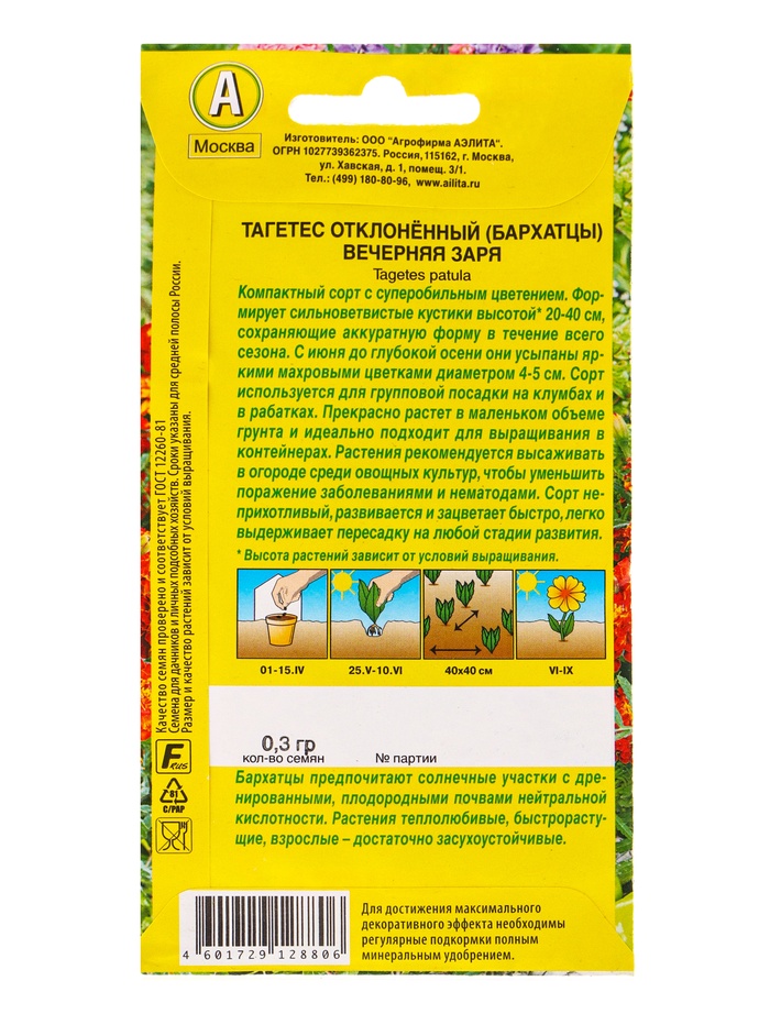 Семена цветов Бархатцы Вечерняя заря отклоненные , Ц/П,0,3 г — Характеристики