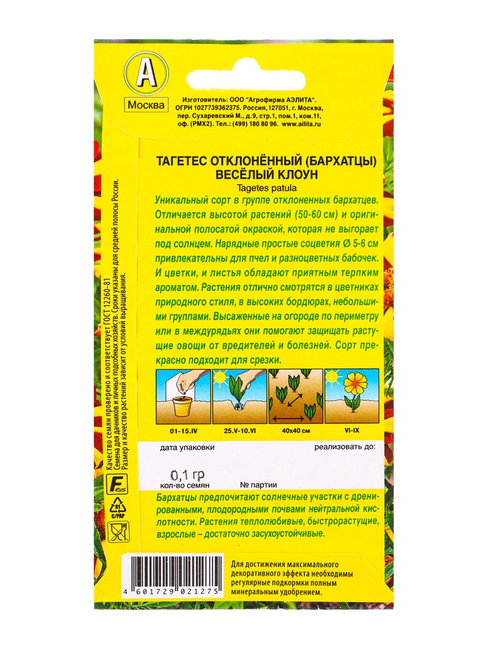 Семена цветов Бархатцы «Весёлый клоун», отклонённые, 0.1 г, «АЭЛИТА» — Характеристики