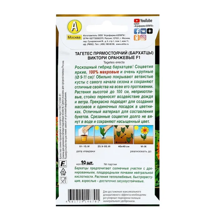 Семена цветов Бархатцы «Виктори оранжевые» F1, прямостоячие, ц/п, 10 шт. — Характеристики