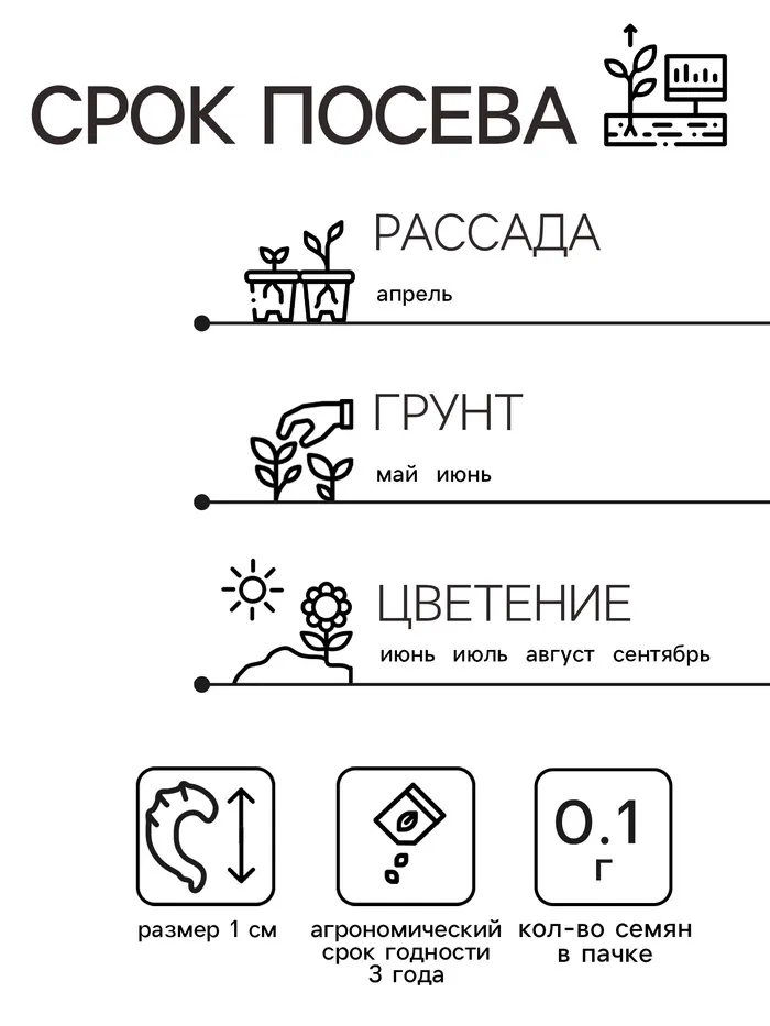 Посев: проводите в первой половине апреля рассадным способом. Всходы появятся через 4–8 дней. Сеянцы пикируйте в фазе 1–2 настоящих листьев. Молодые растения помещайте в почву в конце мая или начале июня. Схема посадки —30 × 30 см. Возможен посев в открытый грунт в мае на глубину 1,5–2 см.