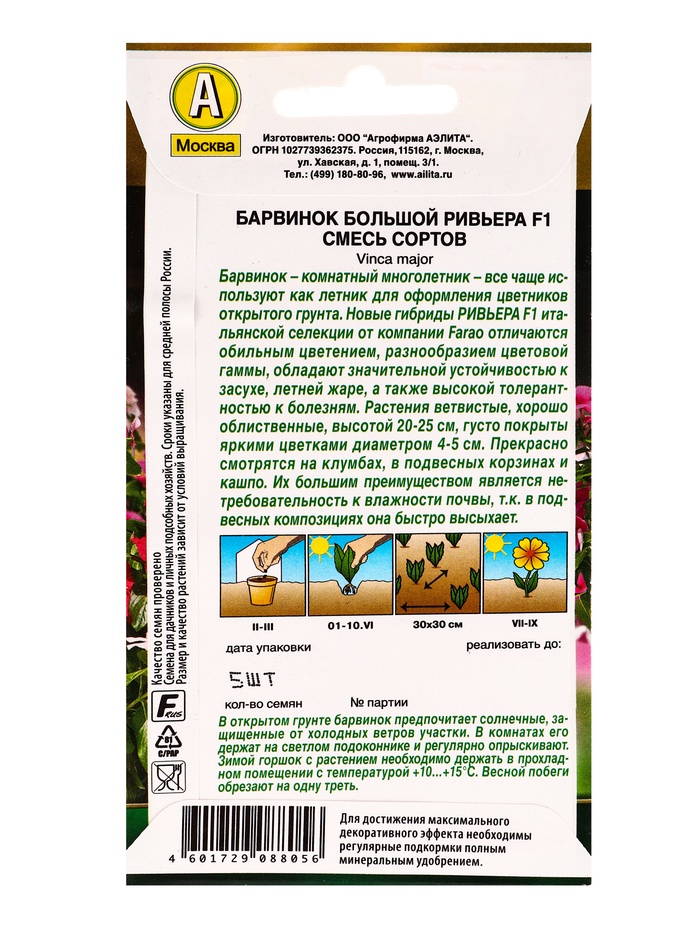 Семена цветов Барвинок Ривьера F1, смесь сортов С. Farao Золотая серия, Ц/П,5 шт. — Характеристики