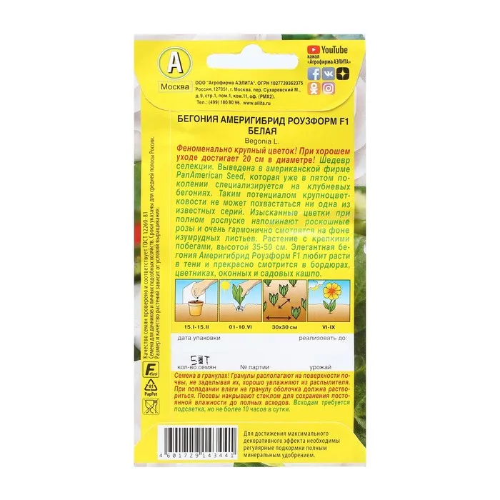 Феноменально крупный цветок. При хорошем уходе достигает 20 см в диаметре. Шедевр селекции. Выведена в американской фирме PanAmerican Seed, которая уже в пятом поколении специализируется на клубневых бегониях. Таким потенциалом крупноцветковости не может похвастаться ни одна из известных серий. Изысканные цветки при полном роспуске напоминают роскошные розы и очень гармонично смотрятся на фоне изумрудных листьев. Растение с крепкими побегами, высотой 35-50 см. Элегантная бегония Америгиб рид Роузформ F1 любит расти в тени и прекрасно смотрится в бордюрах, цветниках, оконных и садовых кашпо.Семена в гранулах! Гранулы располагают на поверхности почвы, не заделывая их, хорошо увлажняют из распылителя. При попадании влаги на гранулу оболочка должна раствориться. Посевы накрывают стеклом для сохранения постоянной влажности до полных всходов. Всходам требуется подсветка, но не более 10 часов в сутки.