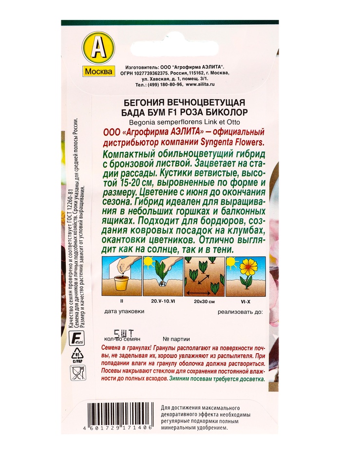 Семена цветов Бегония Бада бум F1 роза биколор (драже в пробирке) Спецсерия Syngenta, Ц/П,5 шт. 109 — Характеристики
