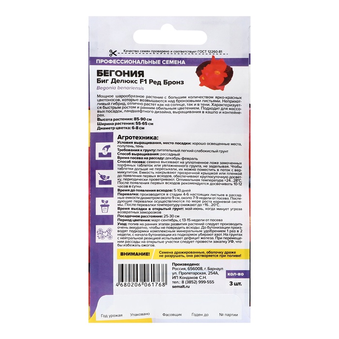 Семена цветов Бегония Биг Делюкс F1 Ред бронз, ц/п, 3 шт. — Характеристики