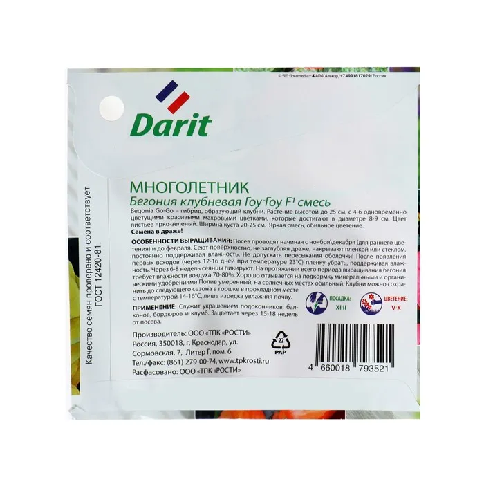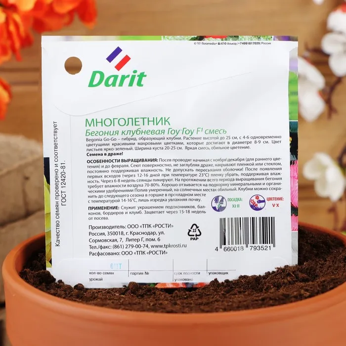 Особенности выращивания: Посев проводят начиная с ноября\декабря (для раннего цветения) и до февраля. Сеют поверхностно, не заглубляя драже, накрывают пленкой или стеклом, постоянно поддерживая влажность. Не допускать пересыхания оболочки. После появления первых всходов (через 12-16 дней при температуре 23°с) пленку убрать, поддерживая влажность. Через 6-8 недель сеянцы пикируют. На протяжении всего периода выращивания бегония требует влажности воздуха 70-80%. Хорошо отзывается на подкормку минеральными и органическими удобрениями. Полив умеренный, на солнечных местах обильный. Клубни можно сохранить до следующего сезона в горшке в прохладном месте с температурой 14-16°с, лишь изредка увлажняя почву.