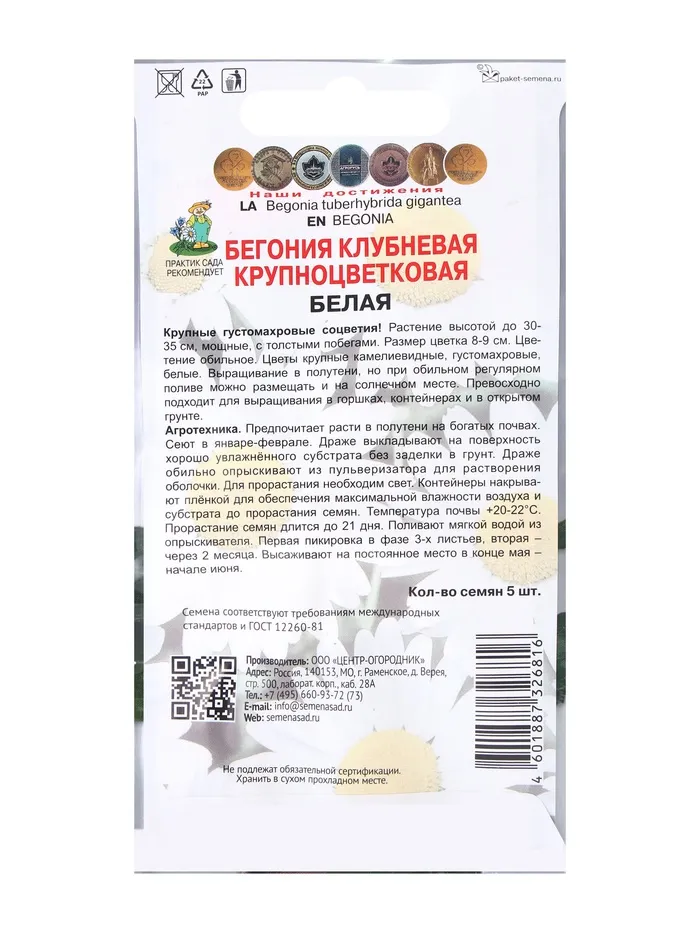 Семена цветов Бегония клубневая крупноцветковая Белая, 5шт — Характеристики