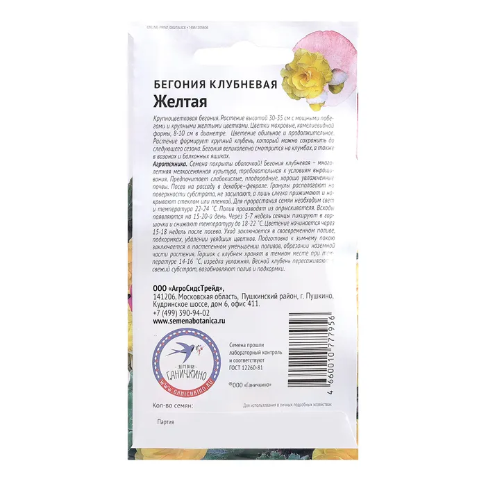Семена цветов Бегония клубневая "Желтая", 6 шт — Характеристики