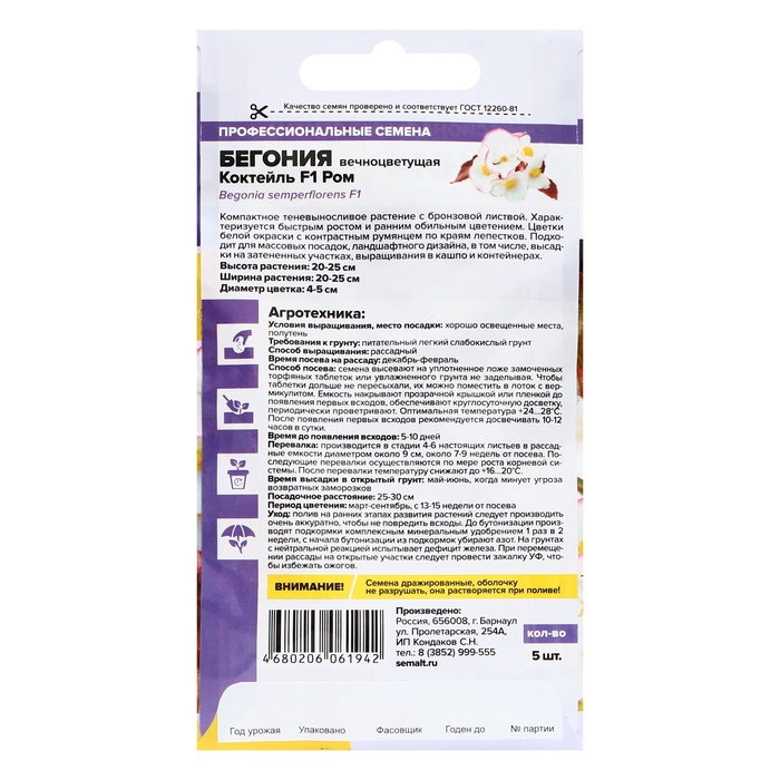 Семена цветов Бегония Коктейль F1 Ром вечноцветущая, ц/п, 5 шт. — Характеристики