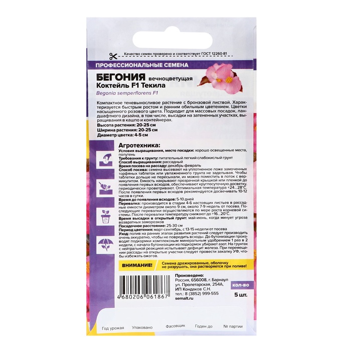 Бегония «Коктейль F1 Текила» — это нежное и яркое растение, которое станет украшением любого балкона. Это светолюбивое растение отличается розовыми цветами и кустовой формой, что делает его идеальным для выращивания в горшках.