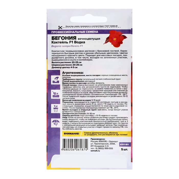 Семена цветов Бегония Коктейль F1 Водка вечноцветущая, ц/п, 5 шт. — Характеристики
