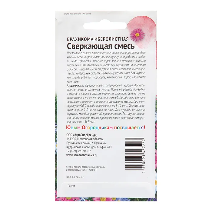 Прелестное сильно разветвленное однолетнее растение брахикомы легко выращивать, поскольку ему не требуется особого ухода. Цветет в течение трех летних месяцев изящными листьями и звездчатыми соцветиями-корзинками диаметром 3-3,5 см . Высота 25-30 см. Данная смесь включает в себя цветы разнообразных окрасок. Брахикому используют для украшения клумб, рабаток, бордюров, каменистых горок, горшечной культуры. Агротехника: Предпочитает плодородные, хорошо дренированные почвы и солнечные места. Посев на рассаду проводят в марте в ящики с легким песчаным грунтом. Семена слегка вдавливают в почву, не присыпая землей. Посадочную емкость накрывают стеклом и ставят в освещенное место. При температуре +20 'С всходы появляются на 8-12 день. Сеянцы пикируют в фазе 2-3 настоящих листьев. Для лучшего ветвления верхушки молодых растений прищипывают. Рассаду высаживают на постоянное место проводят после окончания заморозков, по схеме 15х20 см. Штрих-код -