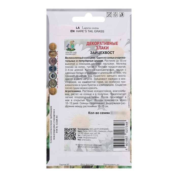 Великолепный сухоцвет. Один из самых очаровательных и популярных злаков. Растение до 50 см высотой с нежными мягкими листьями. Метелка похожа на колос, густая и плотная продолговатая, 3-4 см длиной. Колоски одноцветковые, чешуи с длинным белым опушением и длинными остями, что придает соцветию вид пушистого заячьего хвоста. Цветет в июле-августе. Зайцехвост наряден в миксбордере, на каменистой горке, но особенно привлекателен в сухих букетах и композициях. Соцветия после сушки можно красить.Агротехника. Растение холодостойкое, влаголюбивое, растет на солнце и в полутени. Предпочитает легкие плодородные почвы. Посев производят в мае в открытый грунт. Всходы появляются через 10-12 дней. Сеянцы прореживают, выдерживая расстояние между растениями 10-15 см.Семена соответствуют требованиям международных стандартов и ГОСТу РФ 12260-81