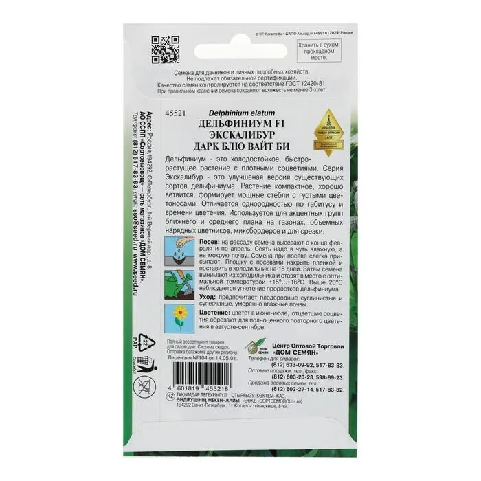Семена цветов Дельфиниум "Экскалибур Дарк Блю Вайт Би", F1 , 10 шт. — Характеристики