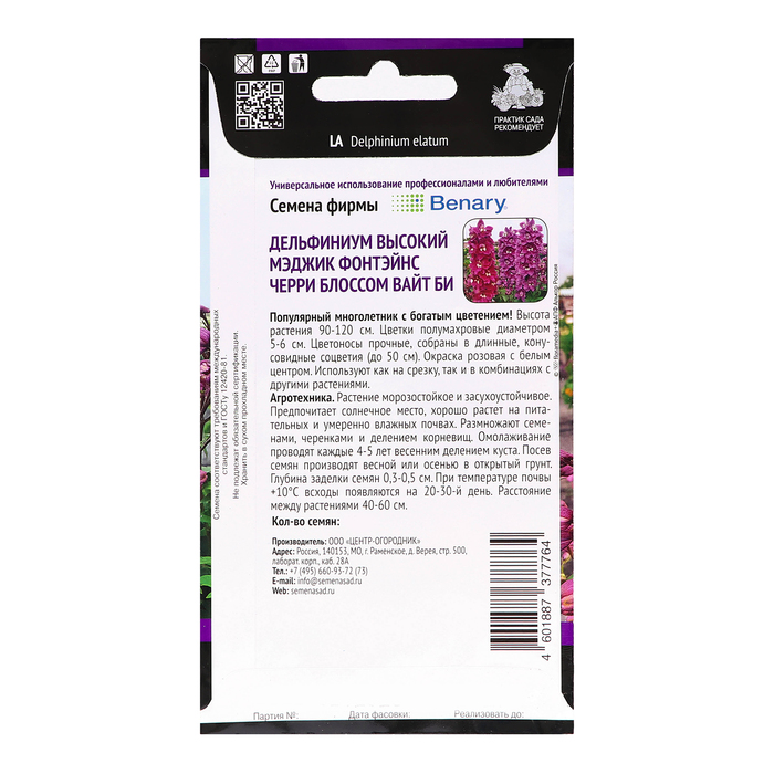 Семена цветов Дельфиниум высокий "Мэджик Фонтэйнс Черри Блоссом Вайт Би", 10шт — Характеристики