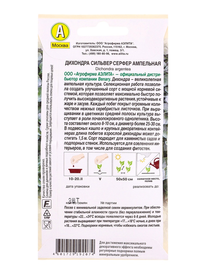 Семена цветов Дихондра Сильвер серфер ампельная Спецсерия Benary, Ц/П,3 шт. — Характеристики