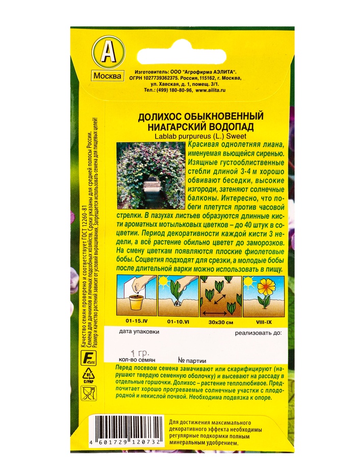 Семена цветов Долихос Ниагарский водопад , Ц/П,1 г — Характеристики