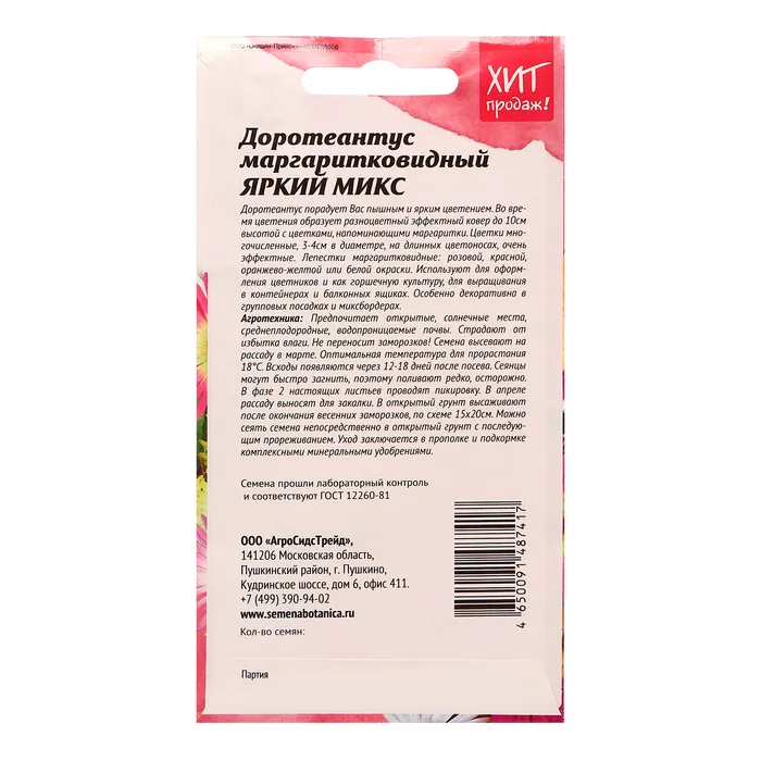 Доротеантус порадует Вас пышными яркимцветением. Во время цветения образует разноцветный эффектный ковер до 10см высотой с цветками, напоминающими маргаритки. Цветки многочисленные, 3-4см в диаметре, на длинных цветоносах, очень эффектные. Лепестки маргаритковидные: розовой, красной, оранжево-желтой или белой окраски. Используют для оформления цветников и как горшечную культуру, для выращивания в контейнерах и балконных ящиках. Особенно декоративна в групповых посадках и миксбордерах. Агротехника: Предпочитает открытые, солнечные места, среднеплодородные, водопроницаемые почвы. Страдают от избытка влаги. Не переносит заморозков! Семена высевают на рассаду в марте. Оптимальная температура для прорастания 18°С. Всходы появляются через 12-18 дней после посева. Сеянцы могут быстро загнить, поэтому поливают редко, осторожно. В фазе 2 настоящих листьев проводят пикировку. В апреле рассаду выносят для закалки. В открытый грунт высаживают после окончания весенних заморозков, по схеме 15х20см. Можно сеять семена непосредственно в открытый грунт с последующим прореживанием. Уход заключается в прополке и подкормке комплексными минеральными удобрениями. Штрих-код -