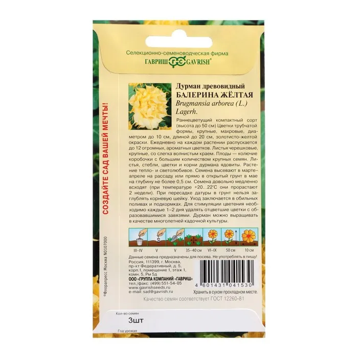 Раннецветущий компактный сорт (высота куста до 50 см) Цветки трубчатой формы, крупные, махровые, диаметром до 10 см, длиной до 20 см, золотисто-желтой окраски. Ежедневно на каждом кусте распускается до 12 огромных, ароматных цветков. Листья черешковые, крупные, со слегка волнистым краем. Плоды – колючие коробочки с большим количеством крупных семян. Листья, стебли, цветки и корни дурмана ядовиты. Растение тепло- и светолюбивое. Семена высевают в марте-апреле на рассаду или прямо в открытый грунт в мае на глубину не более 0,5 см. Семена довольно медленно всходят (при температуре +20…+22 градуса они прорастают 2 недели). При пересадке датуры в грунт нельзя заглублять корневую шейку. Уход заключается в обильных поливах и подкормках. Для стимуляции цветения необходимо каждые 1-2 дня удалять отцветшие цветки с образовавшимися завязями. Дурман можно выращивать в качестве многолетней кадочной культуры.