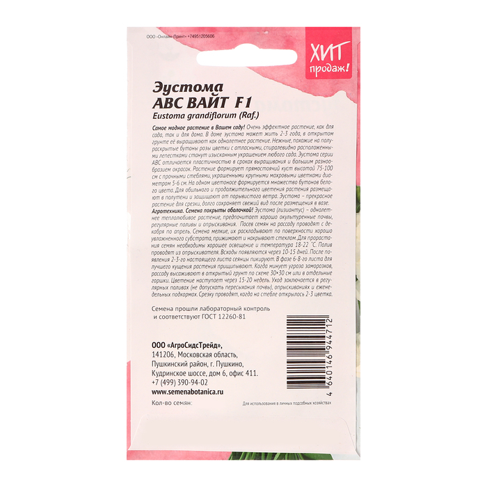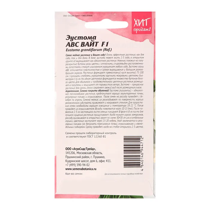Самое модное растение в Вашем саду! Нежные, похожие на полураскрытые бутоны розы цветки с атласными, спиралевидно расположенными лепестками, станут изысканным украшением любого сада. Эустома серии АВС отличается пластичностью в сроках выращивания и большим разнообразием окрасок. Растение формирует прямостоячий куст высотой 75-100 см с прочными стеблями, украшенными крупными махровыми цветками диаметром 5-6 см. На одном цветоносе формируется множество бутонов ярко-фиолетового цвета. Для обильного и продолжительного цветения растения размещают в полутени и защищают от порывистого ветра. Эустома – прекрасное растение для срезки, долго сохраняет свежий вид после размещения в вазе. Агротехника: Семена покрыты оболочкой! Эустома (лизиантус) – однолетнее, теплолюбивое растение, предпочитает хорошо окультуренные почвы, регулярные поливы и опрыскивания. Посев семян на рассаду проводят с декабря по апрель. Семена мелкие, их раскладывают по поверхности хорошо увлажненного субстрата, прижимают и накрывают стеклом. Для прорастания семян необходимо хорошее освещение и температура 18-22˚С. Полив проводят из опрыскивателя. Всходы появляются через 10-15 дней. После появления 2-3-го настоящего листа сеянцы пикируют. В фазе 6-8 листа для лучшего кущения растения прищипывают. Когда минует угроза заморозков, рассаду высаживают в открытый грунт по схеме 30×30 см или в отдельные горшки. Цветение наступает через 15-20 недель. Уход заключается в регулярных поливах (не допускать пересыхания почвы), опрыскиваниях и еженедельных подкормах. Срезку проводят, когда на стебле открылось 2-3 цветка. Штрихкод -