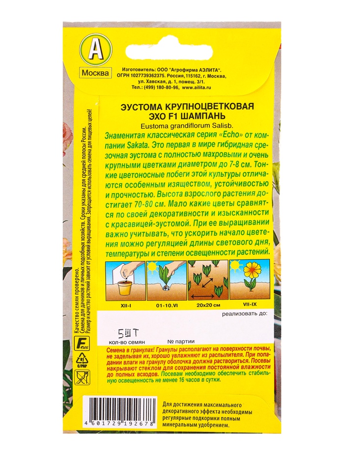Семена цветов Эустома Эхо F1 шампань крупноцветковая (драже в пробирке) С. Sakata, Ц/П,5 шт. 109459 — Характеристики