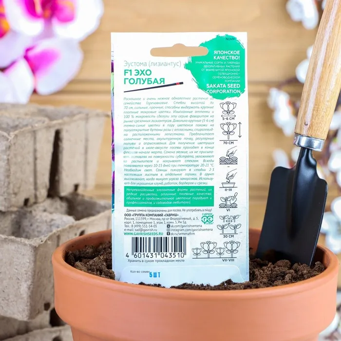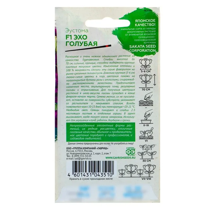 Семена цветов Эустома "Эхо" голубая F1, гранулы, пробирка, О, ц/п, 4 шт. — Характеристики