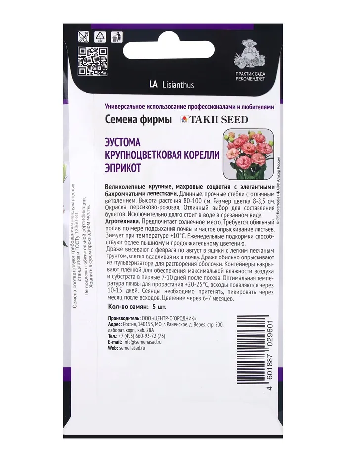 Семена цветов Эустома крупноцветковая Корелли Эприкот, 5шт — Характеристики