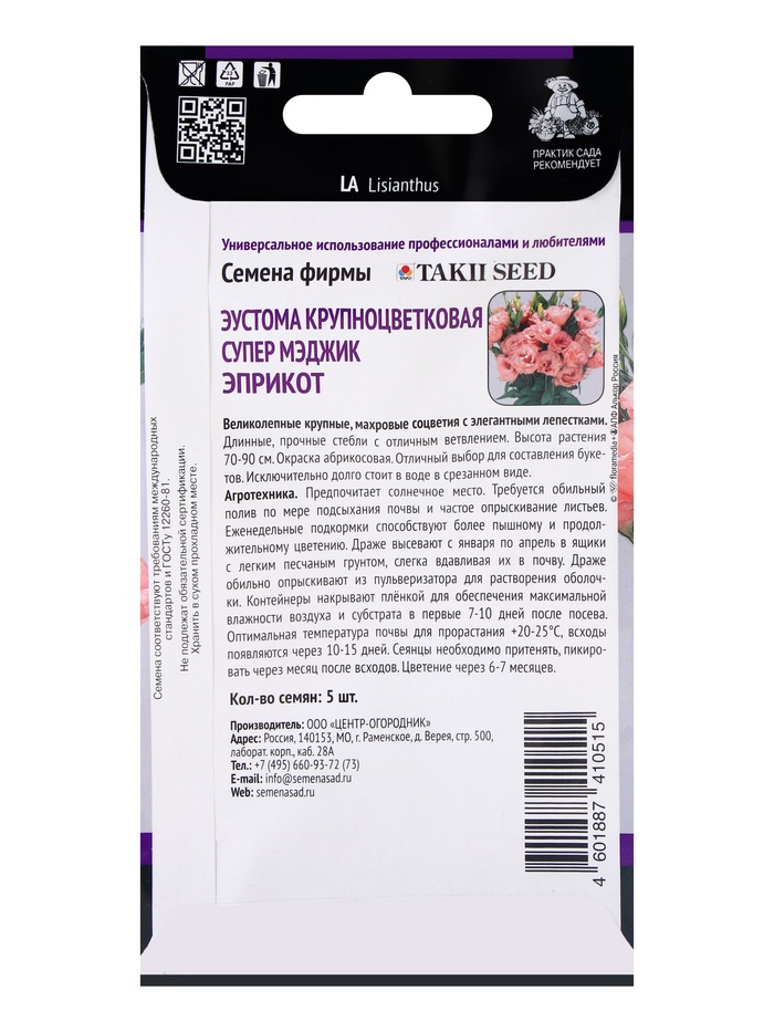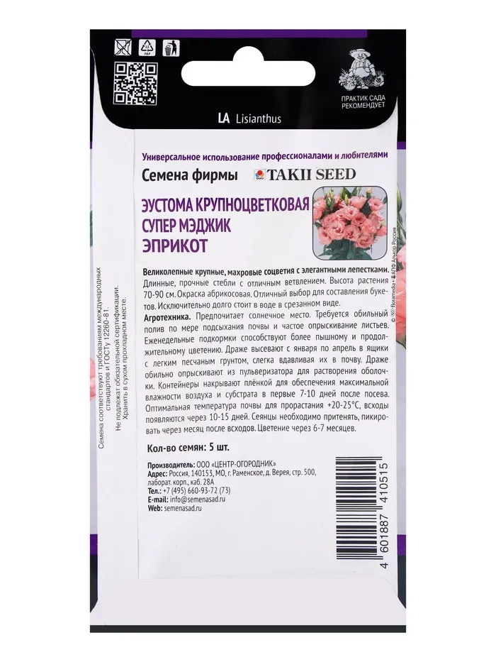 Семена цветов Эустома крупноцветковая Супер Мэджик Эприкот, 5шт — Характеристики