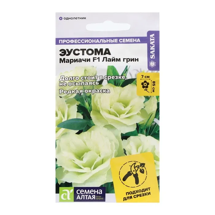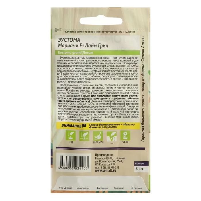 Эустома, лизиантус, «ирландская роза» – вот неполный перечень названий этого прекрасного многолетника, который в открытом грунте выращивается как летник. Полураспустившиеся цветки похожи на бутоны роз. Стебли высотой 75-100 см покрыты крупными, диаметром до 7 см, нежно-салатовыми супермахровыми цветками. Эустома займет достойное место среди Ваших комнатных растений, также она широко используетсядля оформления клумб, рабаток, бордюров. Благодаря прочным лепесткам долго сохраняет свежесть в срезке и хорошо переносит транспортировку.Светолюбивое растение, требует продолжительного светового дня. Предпочитает плодородные легкие, хорошо дренированные почвы с нейтральным уровнем pH. Посев на рассаду проводят с января по март. Для получения наилучшего результата посев рекомендуем проводить в торфяные таблетки диаметром около 40 мм (одно драже в таблетку). В набухших торфяных таблетках подготавливают ложе для посева, немного уплотняя центр. Важно, чтобы семена оставались на поверхности, так как они светочувствительны. После посева семена накрывают пленкой или помещают в мини-парничок, обеспечивая температуру +20-25°С днем и +15-20°С ночью, постоянное увлажнение и досвечивание фитолампой в течение 12-14 часов. Всходы появляются через 10-14 дней, их необходимо регулярно проветривать. Пикировку проводят в фазе 2-3 настоящих листьев, стараясь не травмировать корни. В фазе 4-5 настоящих листьев рассаду пересаживают в постоянные горшки с хорошим дренажом. В сад (под временное укрытие) растения высаживают с конца мая, когда минует угроза заморозков. Посадочный интервал – 30-35 см. Через 2-3 недели укрытие снимают. Эустома требует регулярного полива, но не выносит застоя влаги, полив осуществляют под корень. Для наиболее декоративного цветения рекомендуется 2 раза в месяц проводить подкормку комплексным минеральным удобрением, а также микроудобрениями. Внимание! Семена дражированные - оболочку драже не разрушать!