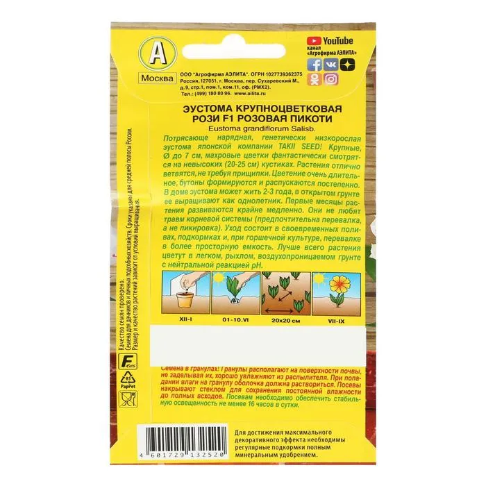 Потрясающе нарядная генетически низкорослая эустома японской селекции! Крупные, до 7 см в диаметре, махровые цветы фантастически смотрятся на невысоких, 20-25 см кустиках. Растения отлично ветвятся, не требуя прищипки. Цветение очень длительное, бутоны формируются и распускаются постепенно. В доме эустома может жить 2-3 года, в открытом грунте её выращивают как однолетник. Первые месяцы растения развиваются крайне медленно. Они не любят травм корневой системы (предпочительна перевалка,а не пикировка). Уход состоит в своевременных поливах, подкормках и, при горшечной культуре, перевалке в более просторную ёмкость. Лучше всего растения цветут в лёгком, рыхлом, воздухопроницаемом грунте с нейтральной реакцией pH.