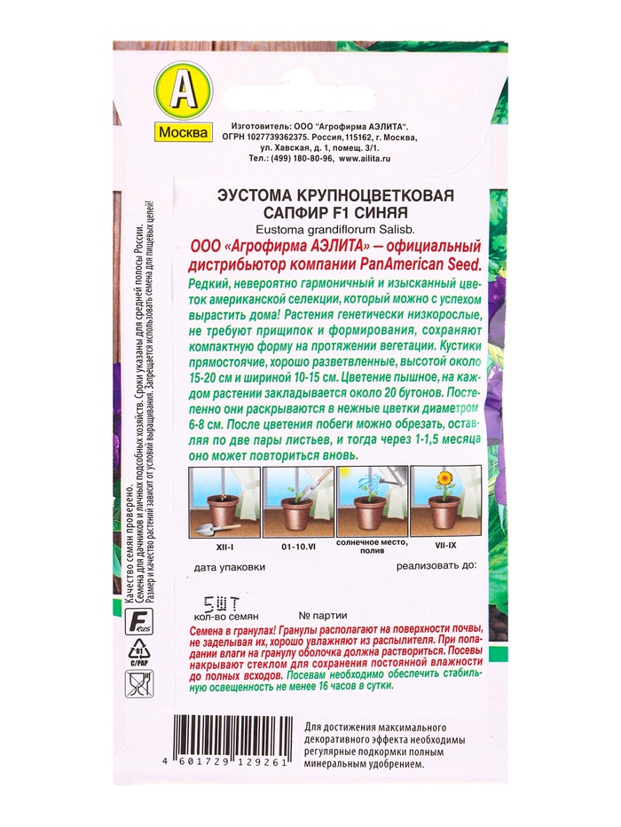 Семена цветов Эустома Сапфир F1 синяя крупноцветковая (драже) PanAmerican, Ц/П,5 шт. — Характеристики