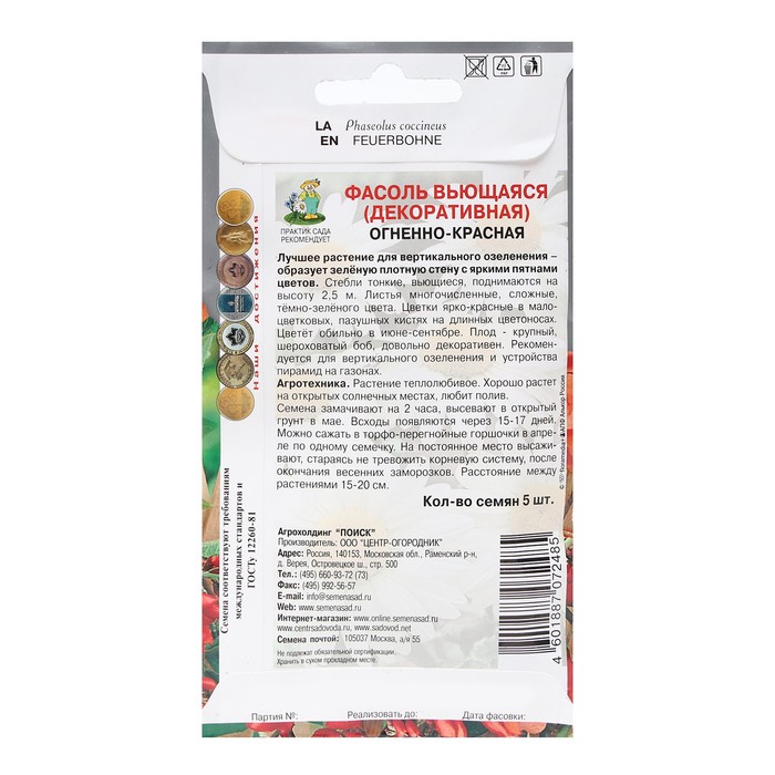 Лучшее растение для вертикального озеленения - образует зелёную плотную стенус яркими пятнами цветов. Стебли тонкие, вьющиеся, поднимаются на высоту 2,5 м. Листья многочисленные, с ,сложные, тёмно-зелёного цвета. Цветки ярко-красные в мало- цветковых, пазушных кистях на длинных цветоносах. Цветёт обильно в июне-сентябре. Плод - крупный, шероховатый боб, довольно декоративен. Рекомендуется для в ля вертикального озеленения и устройства пирамид на газонах. Агротехника. Растение теплолюбивое. Хорошо растет на открытых солнечных местах, любит полив.