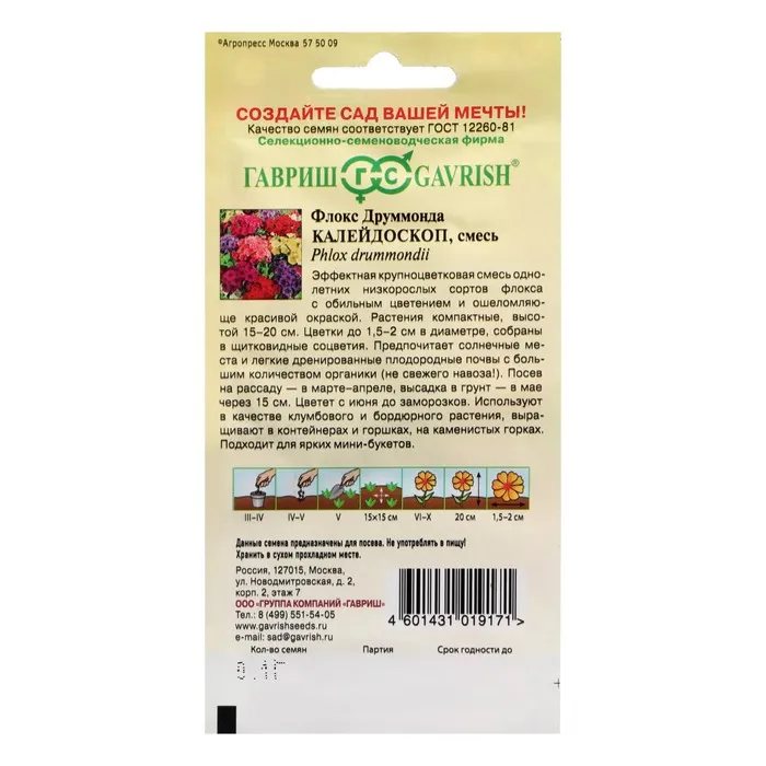 Эффектная крупноцветковая смесь однолетних низкорослых сортов флокса с обильным цветением и ошеломляюще красивой окраской. Растения компактные, высотой 15-20 см. Цветки до1,5-2 см в диаметре, собраны в щитковидные соцветия. Предпочитает солнечные места и легкие дренированные плодородные почвы с большим количеством органики. Посев на рассаду - в марте-апреле, высадка в грунт - в мае через 15 см. Цветет с июня до заморозков. Используют в качестве клумбового и бордюрного растения, выращивают в контейнерах и горшках, на каменистых горках. Подходит для ярких мини-букетов.