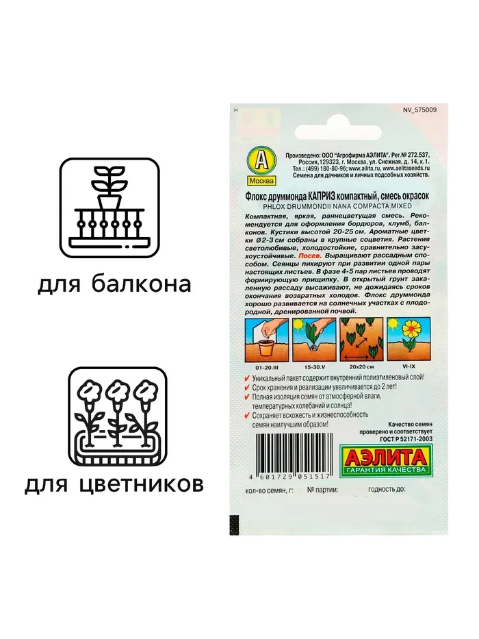 Семена цветов Флокс "Каприз", смесь окрасок, О, 0,2 г — Характеристики