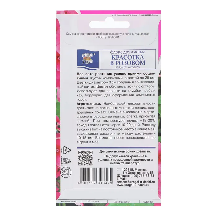Семена цветов Флокс "Красотка в Розовом", 0,1 г — Характеристики