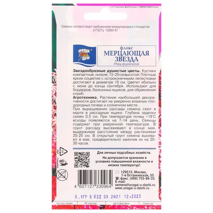 Флокс Мерцающая звезда – распространенное растение, считается декоративным. Основное назначение – украшение бордюров, клумб или балконов. Цветы имеют форму звезд, при этом обладают сильным ароматом. Произрастают на маленьких кустах 15-30 см высотой. Соцветия очень яркие и плотные, лепестки остроконечны, в диаметре достигают около 10 сантиметров. Цветут с июня по октябрь. Также обладают душистым насыщенным ароматом. Существуют сорта, похожие на махровую ткань, у которых лепестки покрыты волосками.