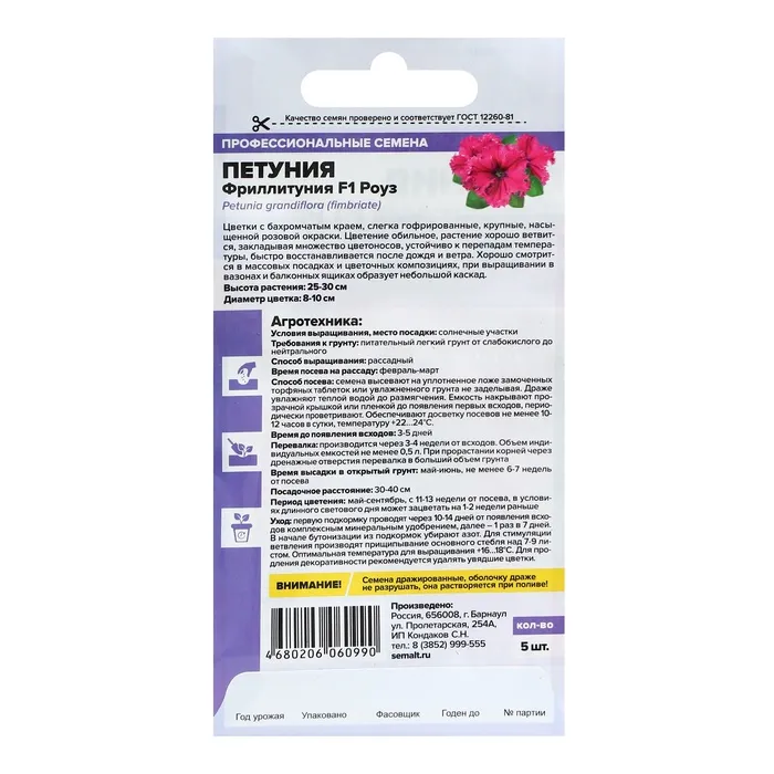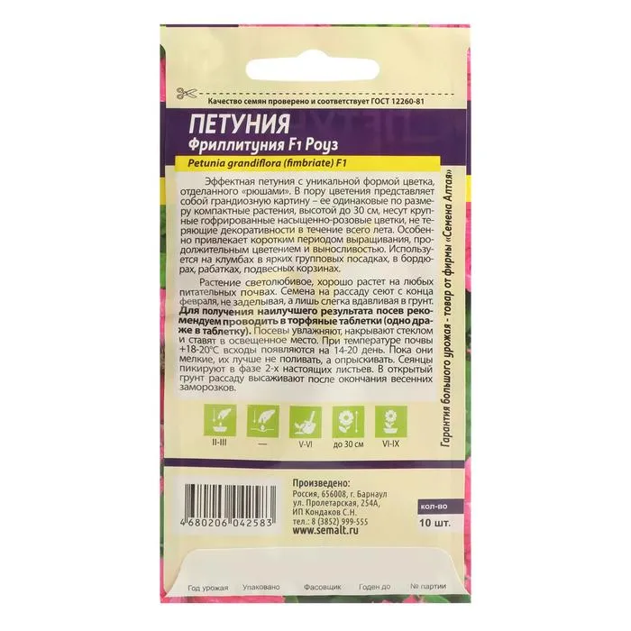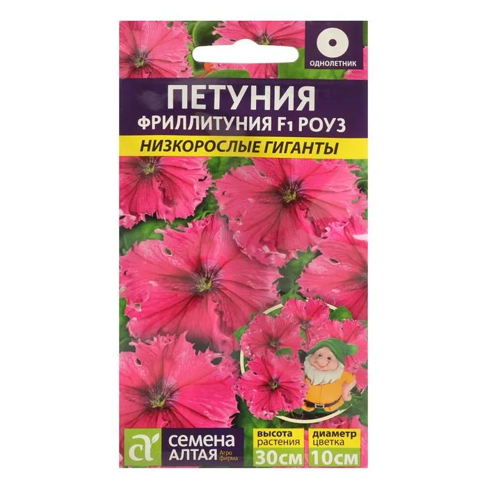 Эффектная петуния с уникальной формой цветка, отделанного «рюшами». В пору цветения представляет собой грандиозную картину – ее одинаковые по размеру компактные растения, высотой до 30 см, несут крупные гофрированные насыщенно-розовые цветки, не теряющие декоративности в течение всего лета. Особенно привлекает коротким периодом выращивания, продолжительным цветением и выносливостью. Используется на клумбах в ярких групповых посадках, в бордюрах, рабатках, подвесных корзинах. Светолюбивое и достаточно засухоустойчивое растение. Предпочитает легкие плодородные, хорошо дренированные почвы. Посевы на рассаду проводят с середины февраля. Семена равномерно распределяют по поверхности субстрата, не заделывая, а лишь слегка вдавливая в грунт. Для получения наилучшего результата посев рекомендуем проводить в торфяные таблетки (одно драже в таблетку). Посевы увлажняют из распылителя и накрывают стеклом для поддержания постоянной влажности. Емкость помещают в светлое теплое место (+22-24°С). Всходы появляются через 10-15 дней, стекло убирают. Февральским посевам требуется дополнительная подсветка. Пока всходы мелкие, их лучше не поливать, а опрыскивать, избегайте попадания на них прямых солнечных лучей. Пикировку проводят в фазе 1-2-х настоящих листочков. В открытый грунт рассаду высаживают в конце мая - начале июня, когда минует угроза возвратных заморозков. Посадочный интервал – 30-40 см. Возможно сохранение растений зимой в освещенном помещении при температуре около +12°С с предварительной обрезкой побегов. Внимание! Семена дражированные - оболочку драже не разрушать!