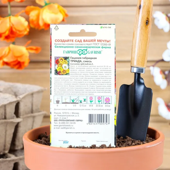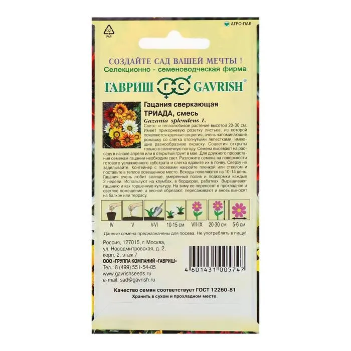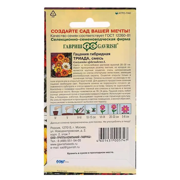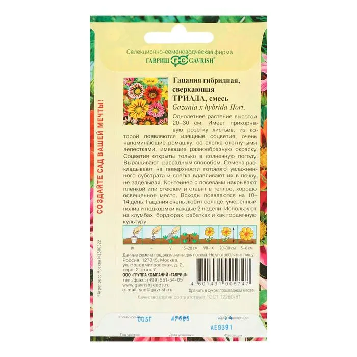 Семена высевают на рассаду в начале апреля или в открытый грунт в мае. Всходы появляются на 10 - 14 день. Гацания очень любит солнце, умеренный полив и подкормки каждые 2 недели. Используют на клумбах, бордюрах, рабатках.